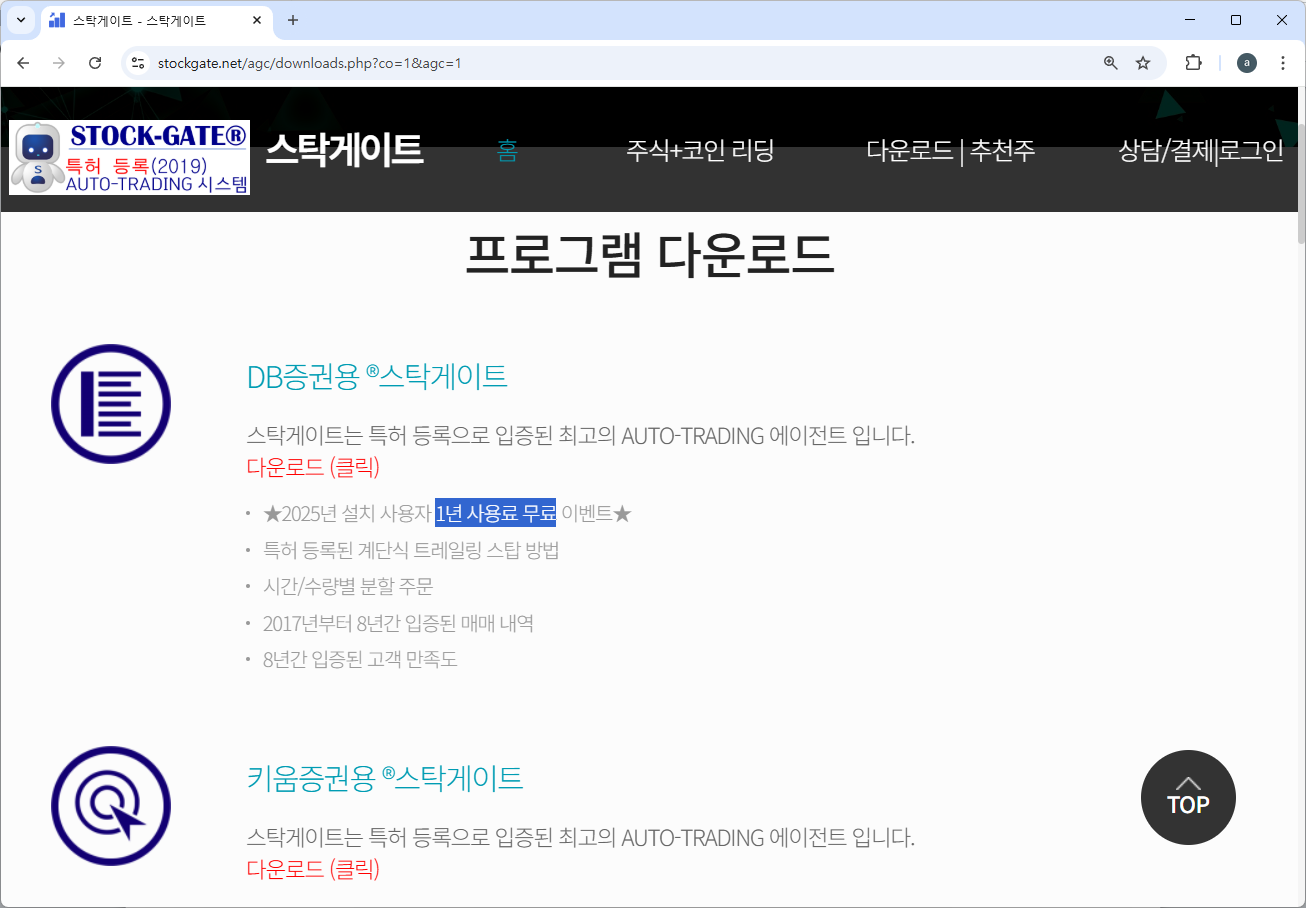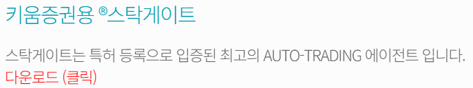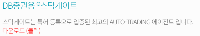 ㈜키움증권용, ㈜DB증권용 등 7개 증권사 프로그램중 고객이 원하는 프로그램은 스탁게이트 홈페이지(http://stockgate.net )의 [다운로드] 페이지에서 다운로드 할 수 있습니다.