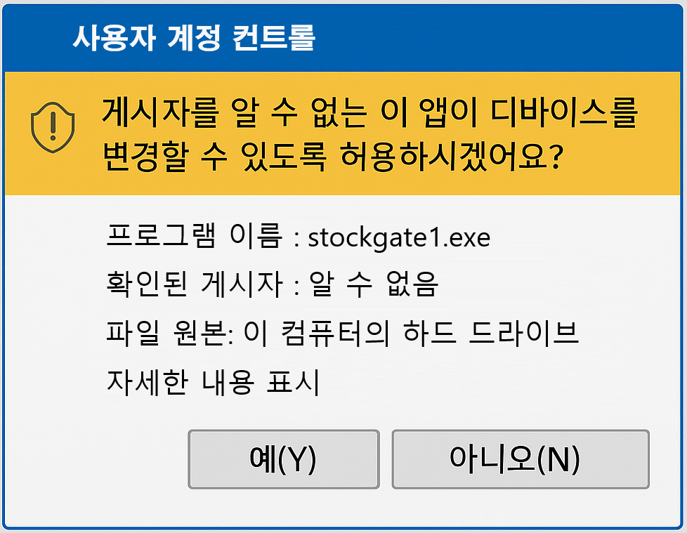 스탁게이트는 ㈜와이소프트코리아 개발팀이 개발한 안전하고 믿을수 있는 프로그램이므로, 사용자 계정 컨트롤을 [예(Y)]를 눌러서, 허용하시면 됩니다.