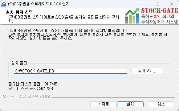 (예) 키움증권용 스탁게이트 1.0은 C:\STOCK-GATE 에 설치되며, DB증권용 STOCK-GATE 2.0은 C:\STOCK-GATE_DB 에 설치됩니다.