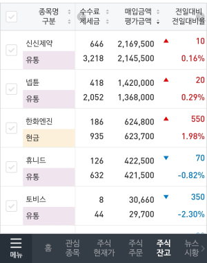 각 수수료는 매수, 매도시 각각 부과되기 때문에, 잔고에 편입시, 매도 수수료까지 합산하여 보여줍니다. 즉, 매수/매도 각각 0.015%라면 잔고의 종목은 매도를 아직 하지 않은 상태이지만, 매도를 고려하여 수수료를 합산하여 보여주고 있습니다.